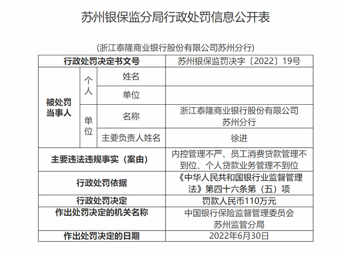 依据《中华人民共和国银行业监督管理法》第四十六条第(五)项,泰隆银行苏州分行遭重罚人民币110万元。