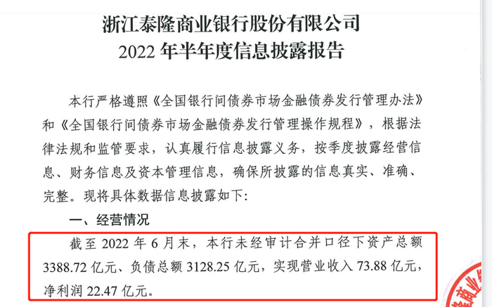 7月29日,泰隆银行公布2022年半年度信披报告显示,截至2022年6月末,该行未经审计合并口径下资产总额3388.72亿元、负债总额3128.25亿元,实现营业收入73.88亿元,净利润22.47亿元。