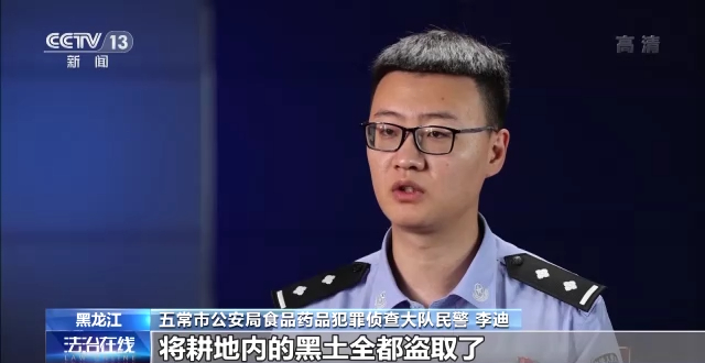 五常市公安局食品药品犯罪侦查大队民警 李迪:我们到现场之后发现老百姓的农用地已经被犯罪嫌疑人使用钩机进行破坏,将耕地内的黑土全都盗取了,盗取了能有将近一米深。现场的耕地被破坏得非常严重,就黑土流失嘛。