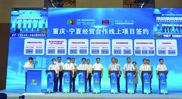 2022年7月21日,重庆·宁夏经贸交流合作对接会上,宁渝经贸合作再结硕果。重庆山江谣文化旅游发展集团与兴庆区人民政府签订中国银川“上河堡”文化旅游综合体项目;新南集团与阅海湾商务区管委会签订新南大厦项目;神麒铝业有限公司、奥能化工有限公司与宁东管委会分别签订树脂基碳质多孔强吸附新材料工业示范项目、年产10万吨蜡精制项目……共计签约11个项目,金额达57.69亿元,涉及绿色食品、清洁能源、新型材料、奶产业等多个领域。