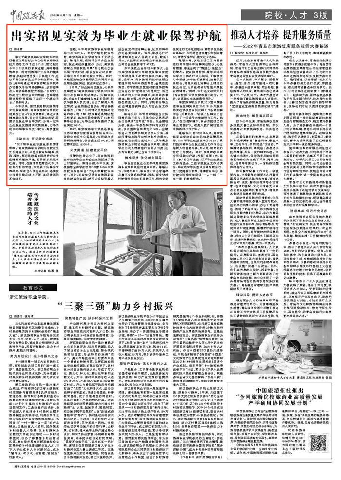 陈瑶表示,自2020年以来,南京旅游职业学院毕业生总体就业情况良好,2021年毕业生就业率为96.8%。“我们始终将毕业生就业创业工作作为立德树人的重要内容,列入校、院两级的党政工作要点。同时,学校积极开展全员促就业行动,按照‘每周1次、每月1次’的工作进度,召开毕业生就业工作推进会、二级学院就业工作协调会、毕业班辅导员座谈会等专题会议,充分挖掘就业资源,搭建就业平台,并对就业困难学生提供‘一人一档’‘一生一策’的精准帮扶。”