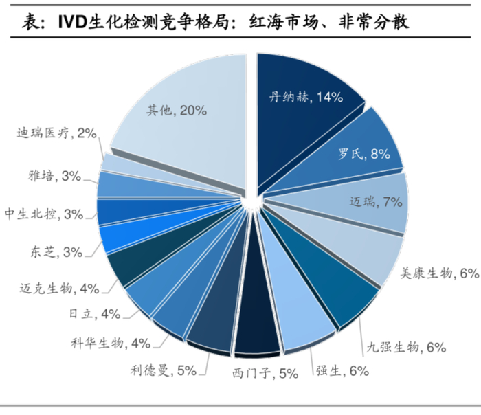 生化试剂,目前主要生产公司包括迈瑞医疗、迈克生物、九强生物、迪瑞医疗、利德曼和美康生物等,最大市场份额的丹纳赫仅占14%,CR15中半数都是国产厂商,在报价时不可避免会更卷。