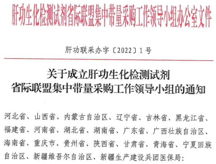 7月27日,一份《关于成立肝功生化检测试剂省际联盟集中带量采购工作领导小组的通知》在业内流传;据悉,该22省市联盟集采工作小组或已初步成立。