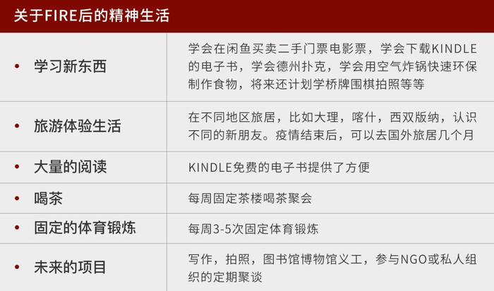 提前想好Fire之后你要过怎样的生活,比如要旅行还是要写作,要提前开始学习。生活方式的改变需要心态和行动上的过渡,没法那么自然衔接。