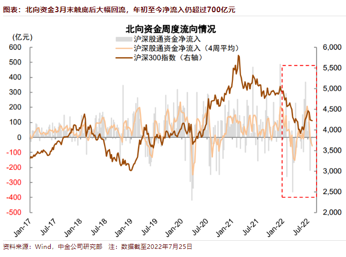 2)北向资金:年初以来海外流动性收紧、地缘风险、中概股监管等因素导致外资一度净流出较多,4月底至7月初反弹中北向资金累计净流入超千亿元,人民币贬值幅度也较有限,相比复杂的海外宏观环境,外资流入整体相对积极且好于市场预期。