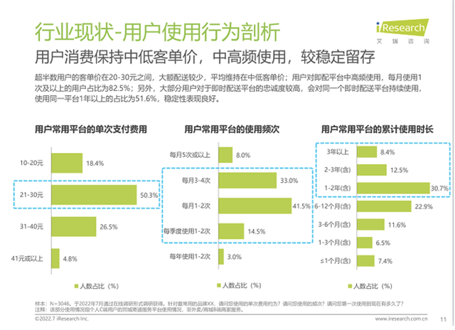 从目前趋势来看,众包骑手运力,并单配送是目前主流的配送方式。通过对用户使用行为的剖析,报告显示,用户客单价不高,大额配送较少,一半以上用户的客单价在20-30元之间,但大多数用户对即配平台保持中高频使用。