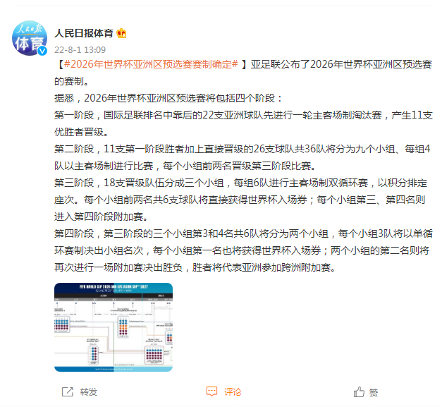 亚足联公布了2026年世界杯亚洲区预选赛的赛制。