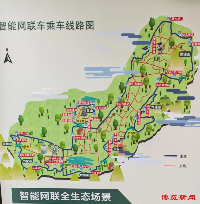 以高新区双创公园城作为全生态应用场景,5G无人驾驶智能网联车的首要功能自然是景区交通工具,搭载乘客游玩观光。车上,一张乘车线路图,清晰标注着串联主城区东部区域四宝山、牧龙山、花山、九顶山等七座山体,以及在建中的蝴蝶桥、姻缘桥、对月桥等六座桥梁近200公里行驶里程和乘车站点。