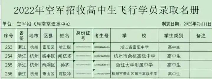 2022年7月,中国人民解放军空军招飞局南京选拔中心在浙江省共招收高中生飞行学员33名,其中杭州地区共录取4名,浙江大学附属中学孙齐、余杭高级中学闻亿多、富阳中学喻志聪、萧山第三高级中学陈毅冲 ,这四位同学成功被录取为空军飞行学员,为校争光,为国护航。
