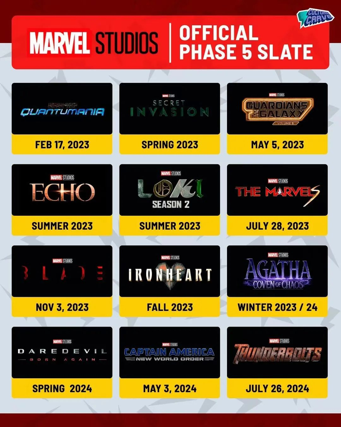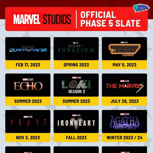 “漫威电影宇宙”(MCU)完整的第五阶段规划和部分第六阶段作品均在此次漫展上正式公布,第五阶段的时间跨度为2023到2024年,包含《蚁人3》《银河护卫队3》《惊奇队长2》《刀锋战士》《美国队长4》《雷霆特工队》共6部电影,和《假如…?*季》《秘密入侵》《回声》《洛基2》《钢铁之心》《阿加莎:混沌女巫》《夜魔侠:重生》共7部剧集。