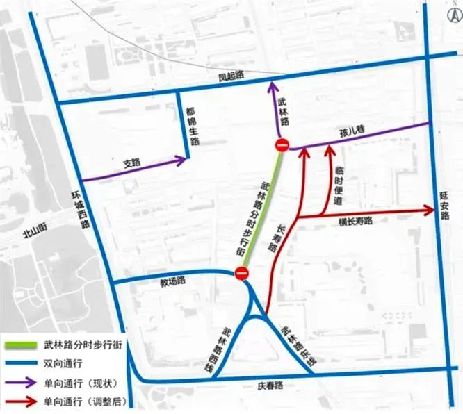 2. 长寿路(武林路-孩儿巷段)实行机动车由南向北单向通行。