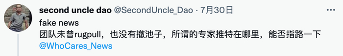 据了解,发币者@SencondUncle_Dao于2022年6月注册了推特账户,但直到7月28日才趁着二舅热度发出*条推文:此项目由“一群旨在帮助二舅的爱心人士发起”,营销钱包将全部捐赠给二舅。“一个人的力量很难和命运抗争,但是一群人的力量却可以帮助二舅走出困境。”