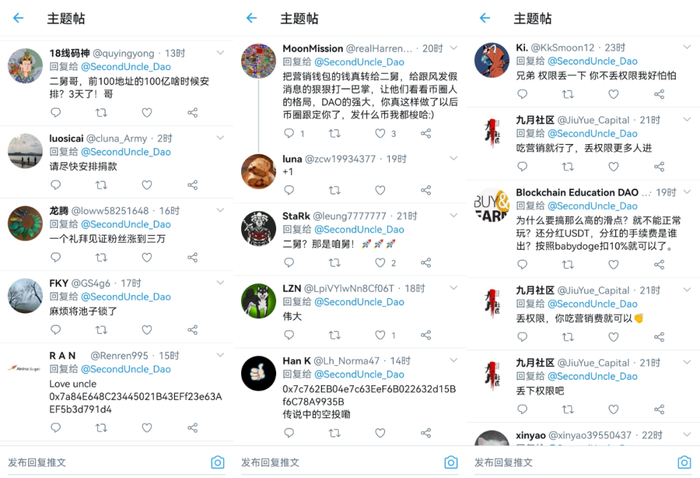 但在发币者的推特评论区,关心二舅命运的人*,人们急切地想要炒高币值,并获得发币者许诺的“百亿空投”(免费发币)奖励。