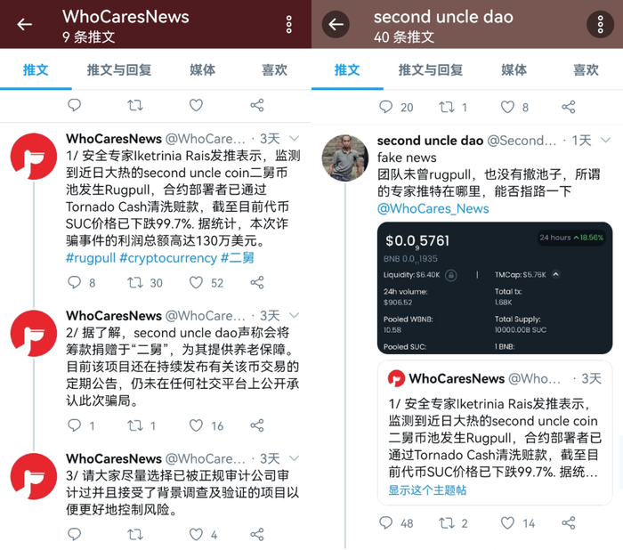 同日,另一网友@WhoCaresNews宣称:据“安全专家”鉴定,“二舅币”涉嫌诈骗130万美元跑路。舆论哗然。
