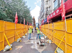 7月的正午,阳光直射,地面温度蹿升。20余名工人头戴安全帽,正在进行开槽施工,施工围挡已经设立……这是道里区新天地小区二次供水管网改造现场。
