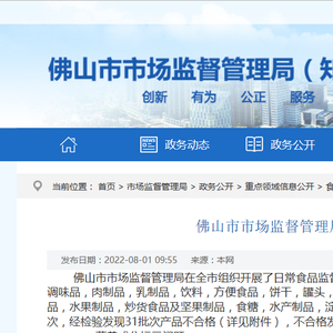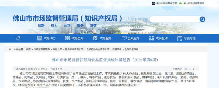 中国质量新闻网讯 8月1日,广东省佛山市市场监督管理局网站发布食品监督抽检质量通告(2022年第8期)。