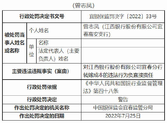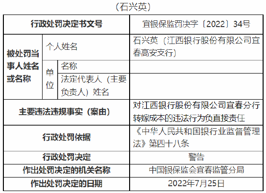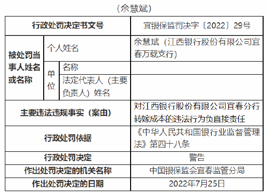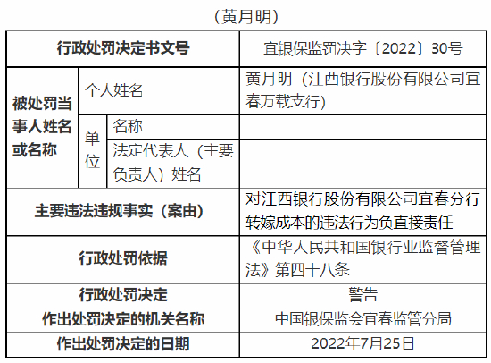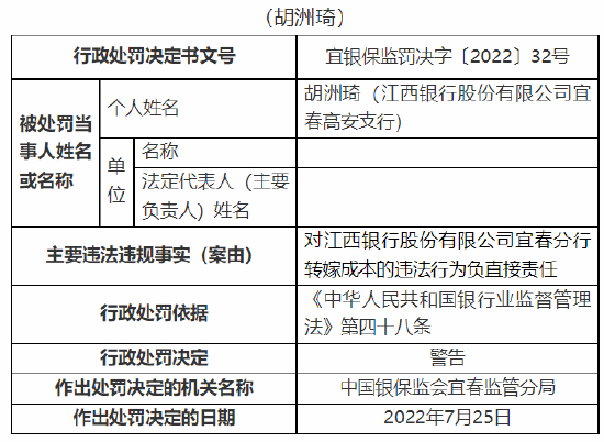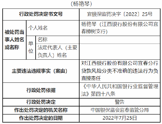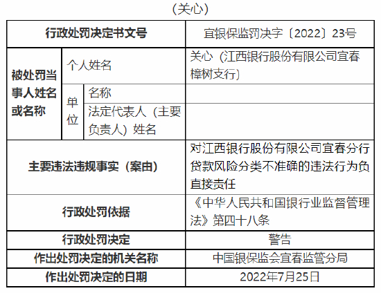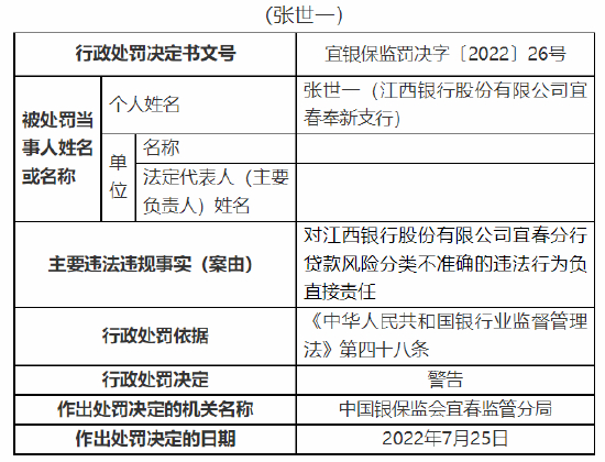 8月2日消息,中国银保监会宜春监管分局行政处罚信息公开表显示,江西银行股份有限公司宜春分行因贷款风险分类不准确、转嫁成本,被监管罚款60万元。