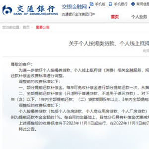 提前还款补偿金,是客户对未到期的贷款进行提前还款,对银行进行的一定利息损失补偿,在此背景下,记者注意到,8月1日,交通银行发布公告显示,自从今年11月起,该行将调整个人按揭类贷款、个人线上抵押贷(消费)提前还款补偿金收费标准。其中,个人按揭类贷款包括了个人住房贷款、个人商业用房贷款、个人厂房贷款等。(北京商报)