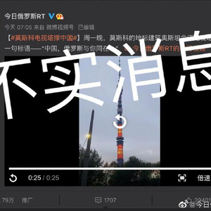 经核实,今早RT发布的#莫斯科电视塔撑中国#为假新闻,我们为这则报道及其在中国社交网络上引起的广泛传播,深表歉意。