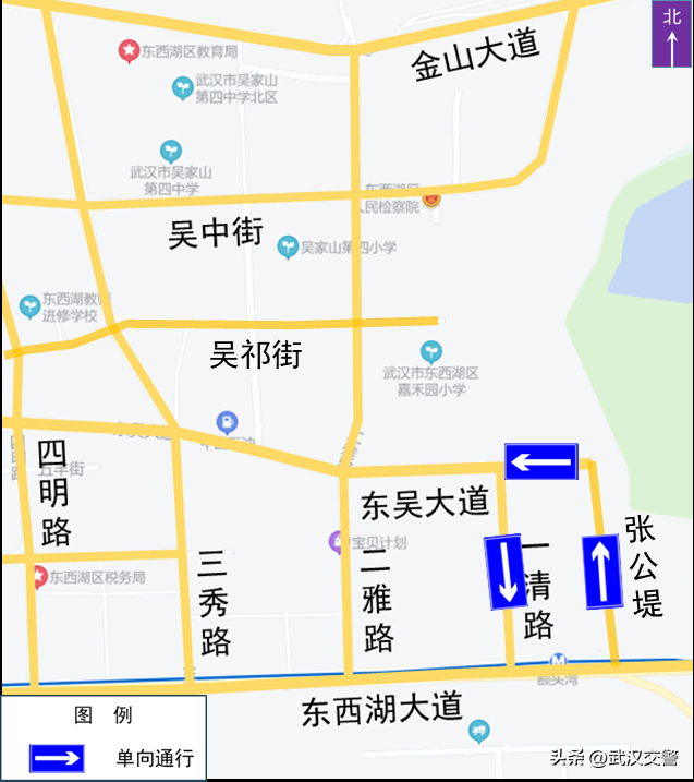 为改善吴家山城区绕行条件,打通张公堤至东吴大道,张公堤路(东西湖大道至东吴大道)、东吴大道(张公堤至一清路)、一清路(东吴大道至东西湖大道)形成单向微循环。