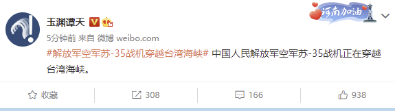 玉渊谭天:中国人民解放军空军苏-35战机正在穿越台湾海峡 界面新闻 界面新闻官方账号 2022.08.0222:23 关注 @玉渊谭天 微博8月2日晚间消息,中国人民解放军空军苏-35战机正在穿越台湾海峡。