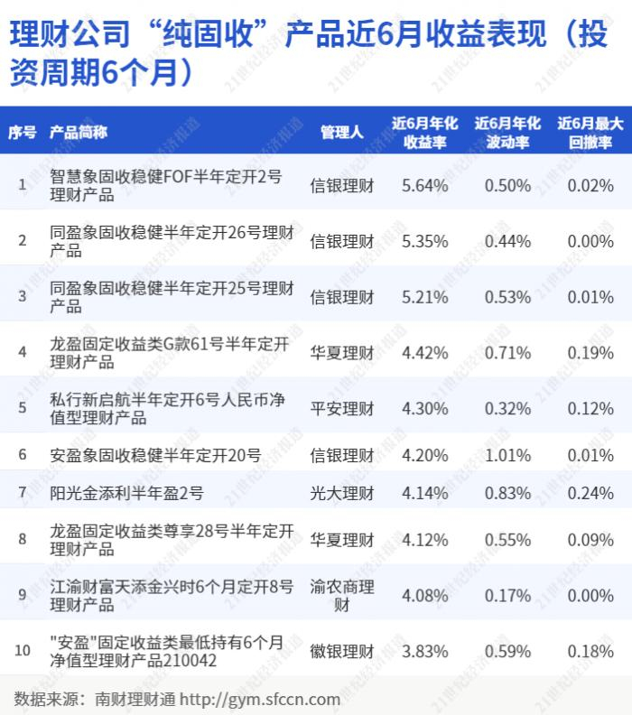 本期值得关注的是,信银理财“智慧象固收稳健FOF半年定开2号”近6月年化收益率达5.64%,位居榜首。
