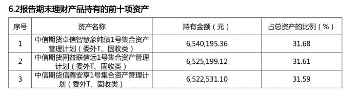 值得注意的是,该产品投资组合中资管产品占比约95%,共3笔,分别为“中信期货卓信智慧象纯债1号集合资产管理计划”、“中信期货固益联信远1号集合资产管理计划”、“中信期货信鑫安享1号集合资产管理计划”,持有金额分别为654.02万元、652.52万元、652.25万元,在总资产的占比均为31%左右。