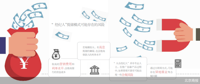 “经纪人”模式是“金融创新”还是打“擦边球”?零壹研究院院长于百程在接受北京商报记者采访时表示,“老带新”“全民经纪人”等营销展业方式,在互联网领域并不少见。不过银行开展此类营销要特别注意其中的风险。首先是较高的营销费用和利率水平会推高银行的资金成本,如果规模较大,有高息揽储的嫌疑,也会推高借款人的利率水平,与监管方倡导的减费让利服务实体经济方向不符;其次,“大众经纪人”并非专业人士,在推广金融产品过程中,如果管理不善有可能出现一些合规风险,通过互联网方式,可能存在异地展业等合规问题。