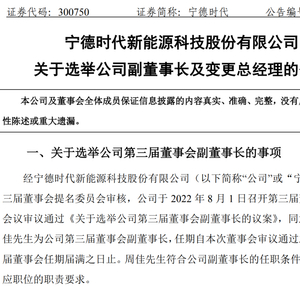 宁德时代最新公告,公司董事会近日收到周佳的书面辞职申请,周佳因工作调整申请辞去公司总经理职务。该辞职申请自2022年8月1日起生效。