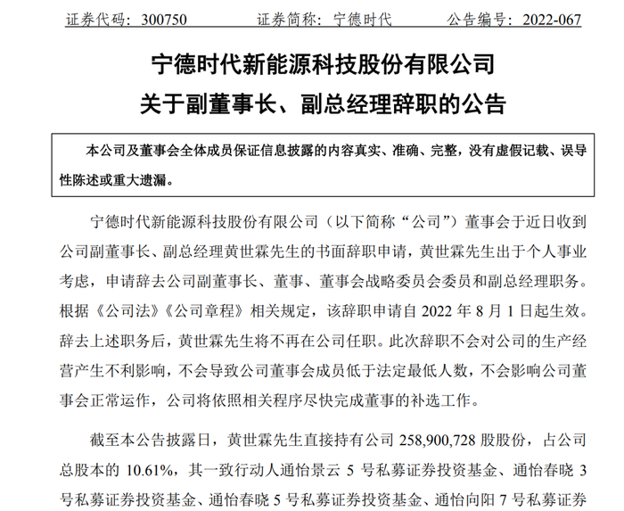 从目前情况看,虽然黄世霖辞任宁德时代副董事长、副总经理等职,但是它与上市公司的关系并没有终结,“纽带”之一在于所持股份。
