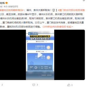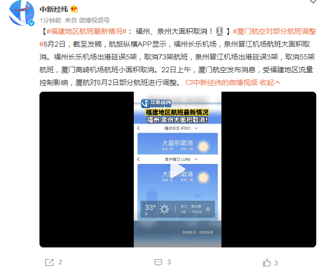 8月2日,截至发稿,航旅纵横APP显示,福州长乐机场,泉州晋江机场航班大面积取消。福州长乐机场出港延误5架,取消73架航班,泉州晋江机场出港延误3架,取消55架航班,厦门高崎机场航班小面积取消。22日上午,厦门航空发布消息,受福建地区流量控制影响,厦航对8月2日部分航班进行调整。
