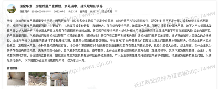 截止到发稿之日,仍有收房业主在武汉城市留言板反馈新问题。