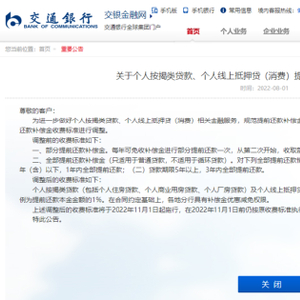 8月1日,交通银行在官网发布了关于个人按揭类贷款、个人线上抵押贷(消费)提前还款补偿金收费调整的公告。其中强调,为进一步做好个人按揭类贷款、个人线上抵押贷(消费)相关金融服务,规范提前还款补偿金收费行为,交通银行对个人按揭类贷款、个人线上抵押贷(消费)提前还款补偿金收费标准进行调整。