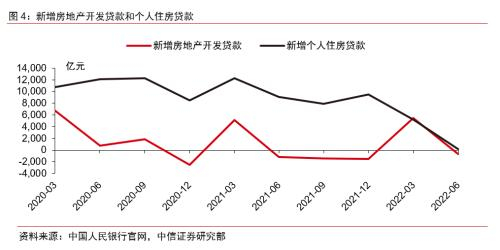 中信证券研报显示,7月末,国股半年期(非三农)票据转贴现利率快速下行,7月29日为0.2%,创下年内新低,可能说明7月信贷投放有一定压力。其中,房地产贷款投放依旧低迷。2022Q2,开发贷款减少700亿元,个人购房贷款也仅增加了200亿元。和去年同期相比,开发贷款少减500亿元,个人购房贷款少增8900亿元。