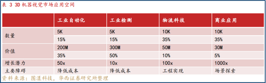 华西证券指出,3D机器视觉的市场空间目前看来是几十K左右,与2D的工业相机大几百K的出货量相比,渗透率只有5%-10%。从增长潜力和增长空间来看,工业自动化会有不少于50倍的增长空间。工业检测目前在行业渗透率上来讲相对比较高,增长空间较小。