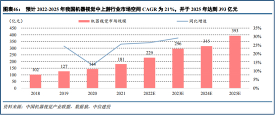 中信建投研报指出,得益于宏观经济回暖、新基建投资增加、数据中心建设加速、制造业自动化推进等因素,预计2022-2025年中国机器视觉中上游市场空间四年CAGR为21.4%,2025年总市场空间将达到393亿元。