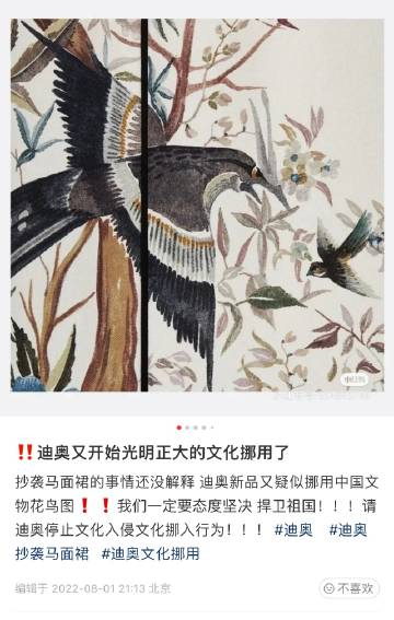 日前,有微博博主发文称,马面裙的事儿还没有回应呢,迪奥又被质疑抄袭花鸟图。目前,迪奥对此还没有相关回应。