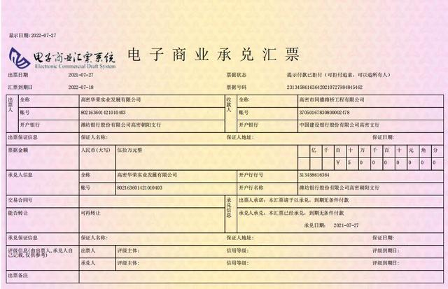 高密华荣的供应商向作者爆料7月中旬的到期电子商业承兑汇票1600万元被拒付,已经多次向高密华荣发起提示付款,均被拒付。供应商多次与高密华荣联系也没有给予具体答复,只反馈目前没钱兑付。