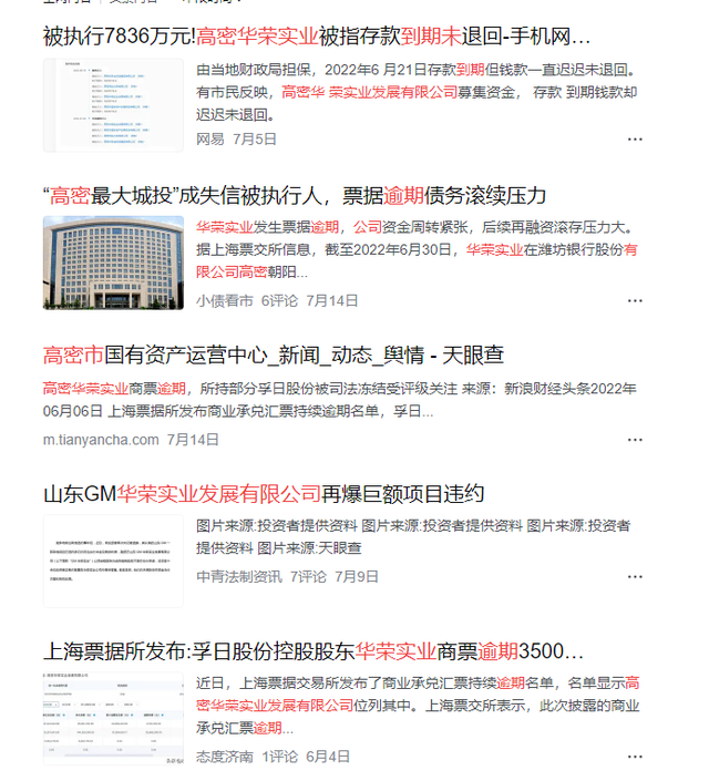高密华荣商票、定融逾期也早有迹象。2021年6月就就爆出高密城投高密投资为发18亿元企业债,伪造国开发展基金印章的狗血事件。2022年7月“高密最大城投”高密华荣成失信被执行人,票据逾期债务滚续压力的暴雷事件。7月13日,高密市城市建设投资集团公告称,根据中国执行信息公开网公示,2022年6月10日高密市国有资产管理有限公司、高密华荣实业发展有限公司(以下简称“华荣实业”)被纳入失信被执行人名单。据公开资料,目前华荣实业同一日三次被列为失信被执行人,涉及与平安国际融资租赁有限公司和平安国际融资租赁(天津)有限公司的融资租赁合同纠纷。