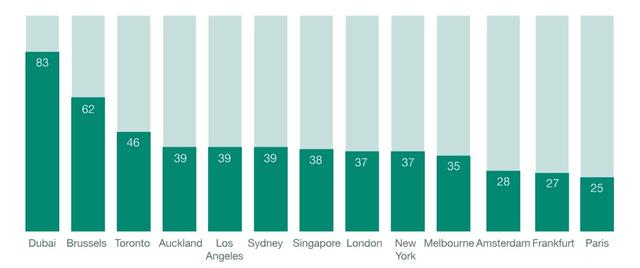 全球前十三个超过25%的常住人口出生在海外的城市(单位:%)