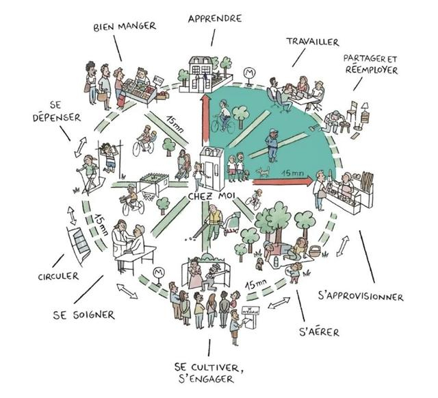 巴黎“一刻钟城市”(左)与新加坡淡滨尼“一站式”邻里中心(右)图示