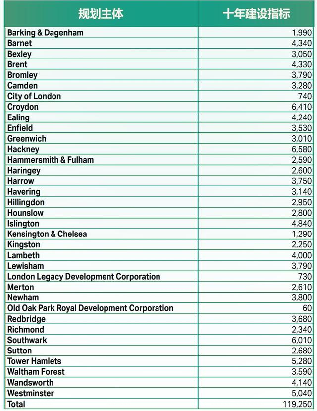 大伦敦各自治区十年内小于0.25公顷地块住房套数建成指标