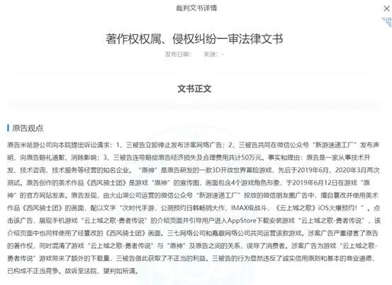 《原神》遭侵权,米哈游诉三七互娱旗下子公司判了
