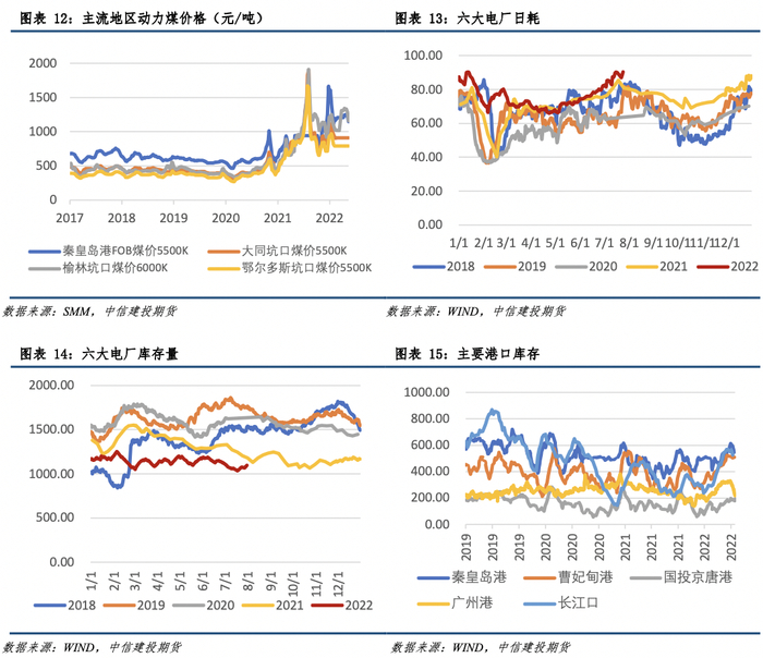 港口跌势延续,煤价区间震荡。供应端看,除部分地区部分煤矿月底煤管票短缺,产量略有下滑外,多数煤矿生产正常。需求端看,受持续高温影响,电厂日耗延续环比上升态势,但涨幅略有收窄,长协保障下部分电厂库存可用天数维持在20天附近,多无采购市场煤计划。非电企业利润较为一般,开工负荷未有明显提升。库存端看,港口煤炭库存有下滑趋势,但仍保持高位水平。短期动力煤价格维持高位震荡概率较大。