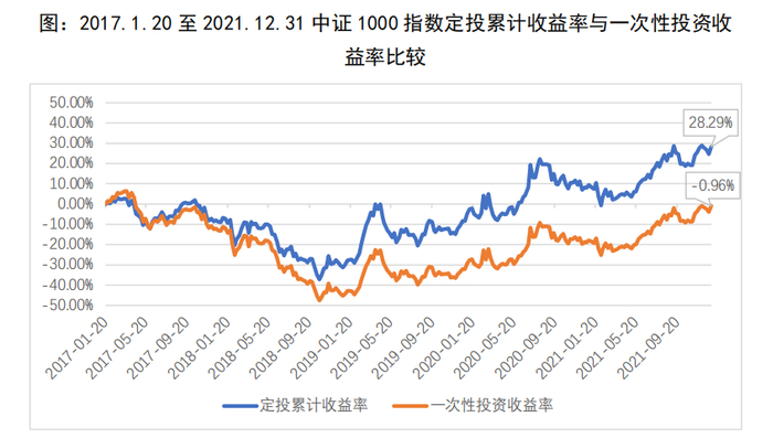 假设我们从2017年1月20日开始,每周五定投500元,截至2021年12月31日,定投收益达到28.29%,年化收益5.35%。若在市场回暖之前放弃定投选择卖出份额,便可能遭受亏损。若不做定投,而是在2017年1月20日一次性买入中证1000指数,在接下来的近五年中无论在哪一个时间点卖出几乎都难以得到可观的收益。到2021年底指数重回8000点时,一次性投资收益率为-0.96%,年化-0.20%。