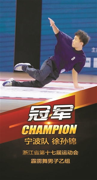 继轮滑之后,街舞(霹雳舞)项目又传来好消息:宁波运动员徐孙锦以3:0战胜台州队的薛羽,获得男子乙组金牌,为宁波代表团拿下竞技体育项目的首金。
