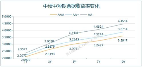 中债5年中短期票据(AAA)收益率报3.0051%,下行1.39BP;中债5年城投债(AAA)收益率报3.0906%,下行2.00BP。