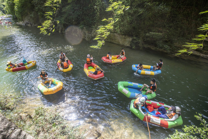 游客在贵州省黔东南苗族侗族自治州施秉县杉木河景区漂流。磨桂宾摄(中经视觉)
