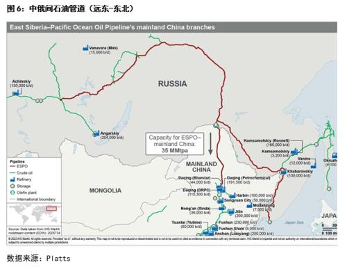 与世界其他主要石油出口国不同,俄罗斯可以通过中部和远东两条石油管道向我国运输原油,中部管道经阿拉山口进入我国新疆,设计运量为2000万吨/年(约合40万桶/日),远东管道则直接进入我国东北,设计运量为3500万吨/年(约合70万桶/日),两条管道合计运量为110万桶/天。