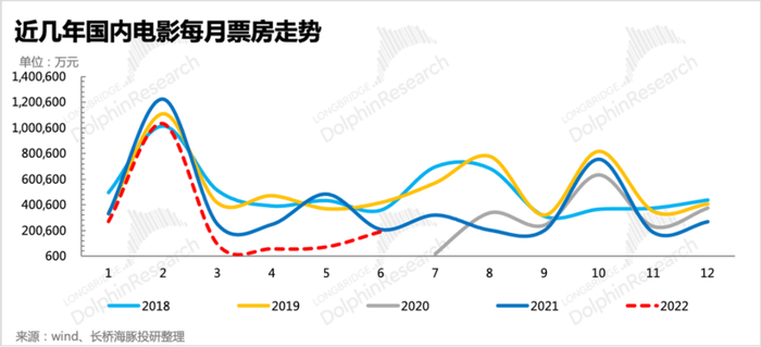 从下图的总票房和总场次来看,6月总场次已经恢复接近2018年水平,但6月总票房还和2018年差距较大,说明主要问题出在需求端。可能部分人群还对疫情心有余悸,并不急于走进影院,另一方面则可能是经济状况对居民需求购买力产生了影响。